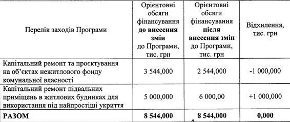 Згідно з Програмою, у 2023 році на капітальний ремонт підвальних приміщень житлових будинків для використання під найпростіші укриття передбачено 5 млн грн. Проте, враховуючи надану проєкто-кошторисну документацію, виникла необхідність збільшити орієнтовні обсяги фінансування цих робіт.