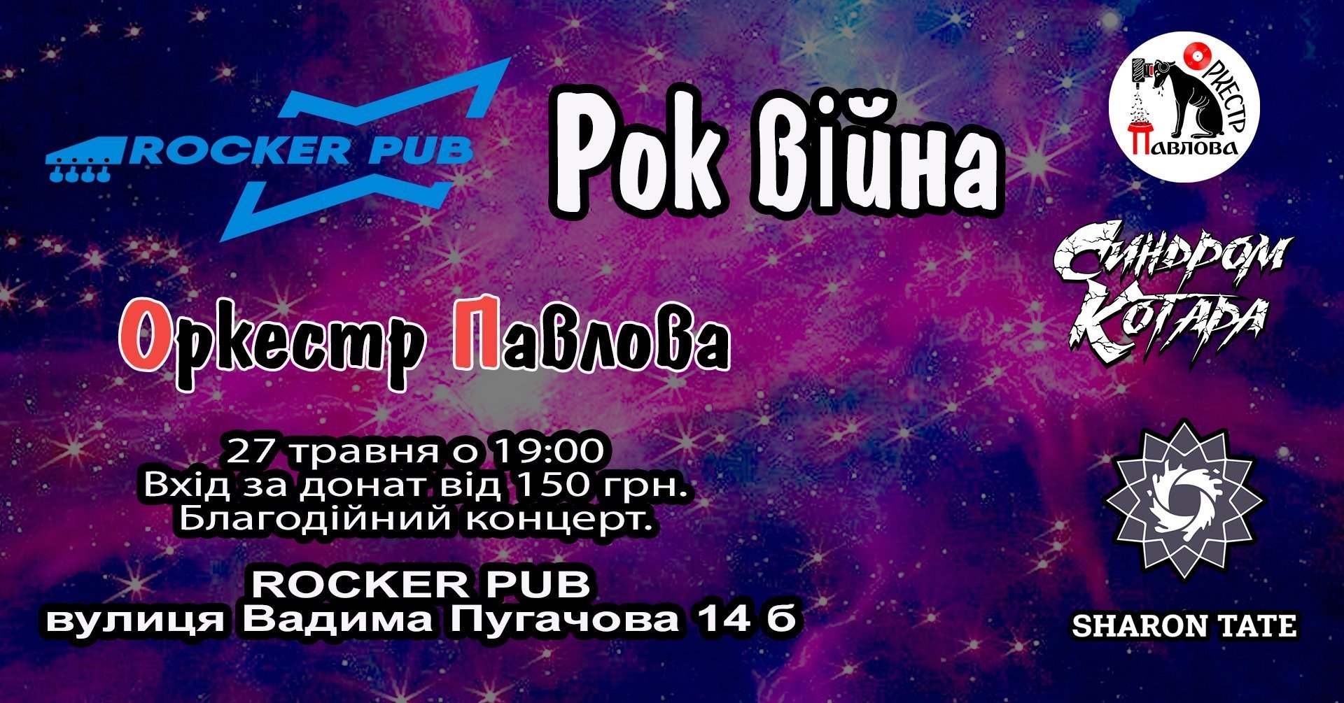 У суботу, 27 травня, о 19.00 у Rocker Concert Pub відбудеться черговий благодійний концерт «Рок-Війна». Виступлять команда з Дніпра «Оркестр Павлова» і два місцеві гурти — SHARON TATE та «Синдром Котара».