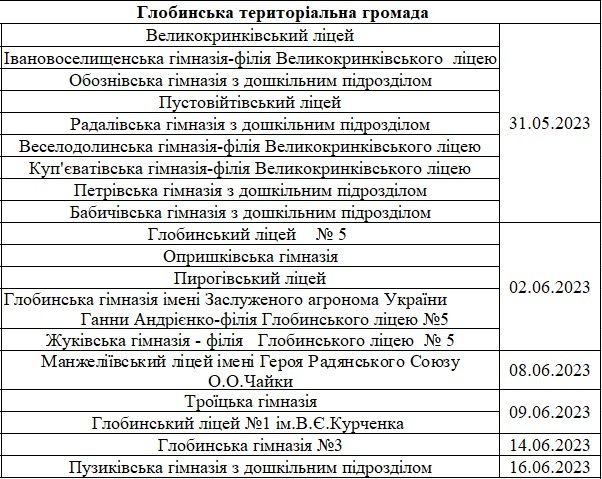 - Горішньоплавнівська, Градизька (лише Пронозівська загальноосвітня школа І-III ступенів – 26 травня), Кам’янопотоківська (лише Білецьківський ліцей – 9 червня), Кременчуцька, Козельщинська, Новогалещиньска, Омельницька, Піщанська, Семенівська – 31 травня;