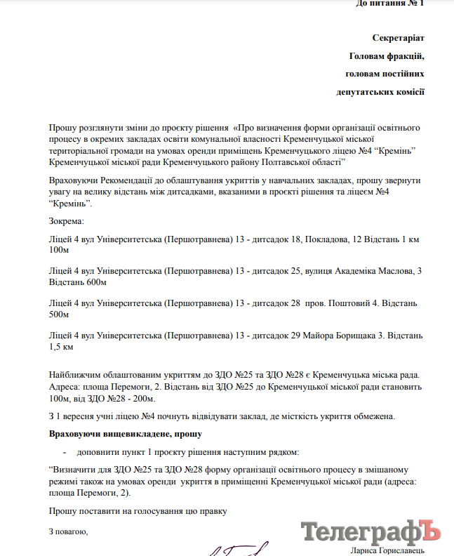 Справа в тому, що укриття ліцею розраховане на 250 людей – тобто всі учні однозначно не вмістяться в укриття, а з вихованцями дитячих садочків – тим більше. Тому депутатка міськради Лариса Гориславець (фракція «Європейська солідарність») запропонувала внести поправку до рішення, щоб вихованці дитсадків використовували укриття у приміщення міської ради. Як аргумент вона надала розрахунки відстані від дитячих садків до ліцею № 4 та приміщення мерії.