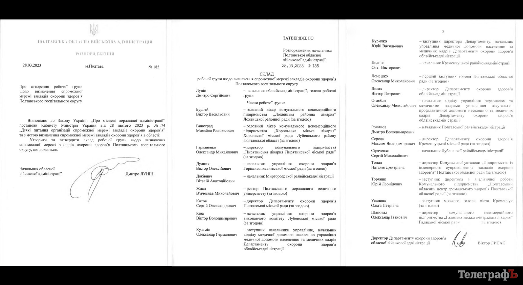 - обласна військова адміністрація видала розпорядження від 28 лютого 2023 р. №185 «Про створення робочої групи щодо визначення спроможної мережі закладів охорони здоров’я Полтавського госпітального округу»;