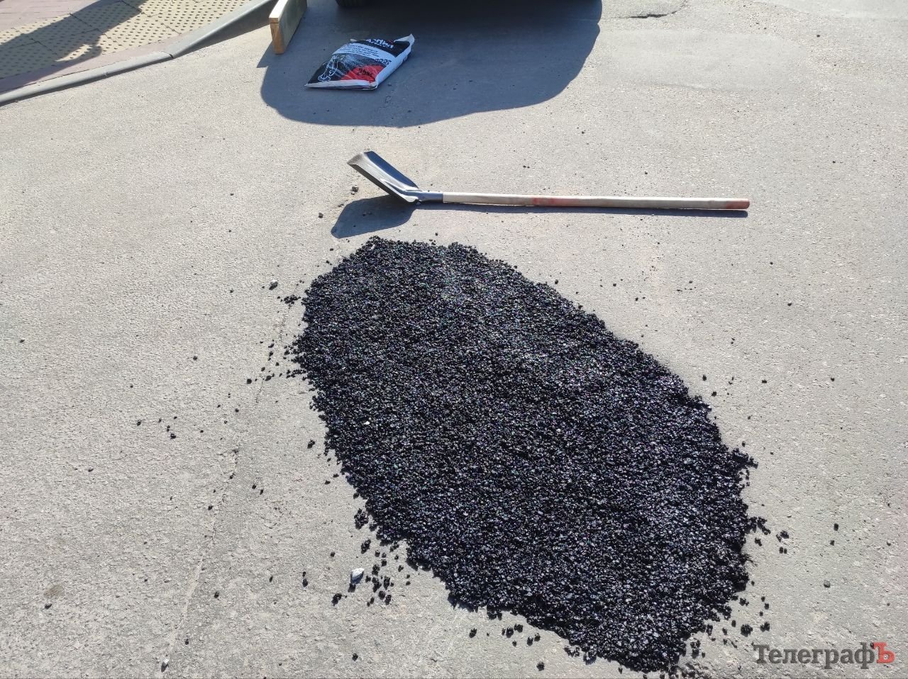 Висипавши магазинну суміш з мішка у яму, за допомогою лопати, дошки та кувалди чоловік робив роботу за комунальників.