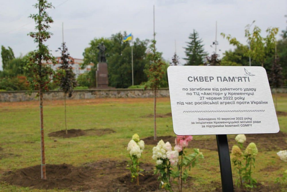 Раніше «Кременчуцький Телеграф» повідомляв, що у вересні минулого року з’явився новий сквер на згадку про загиблих у ТЦ «Амстор». 22 дерева висадили біля пам’ятника Шевченку над Дніпром. Кожне дерево символізує загиблого під час теракту, вчиненого росіянами проти мирних мешканців нашого міста. Висадили 10 «чоловічих» дерев — це клени, та 12 «жіночих» — квітучі сакури і яблуні. Ініціатором створення скверу стали міська рада та компанія Comfy.