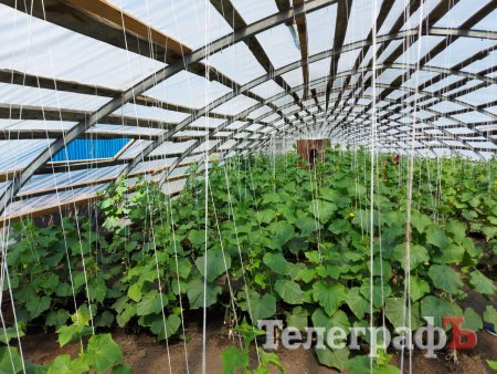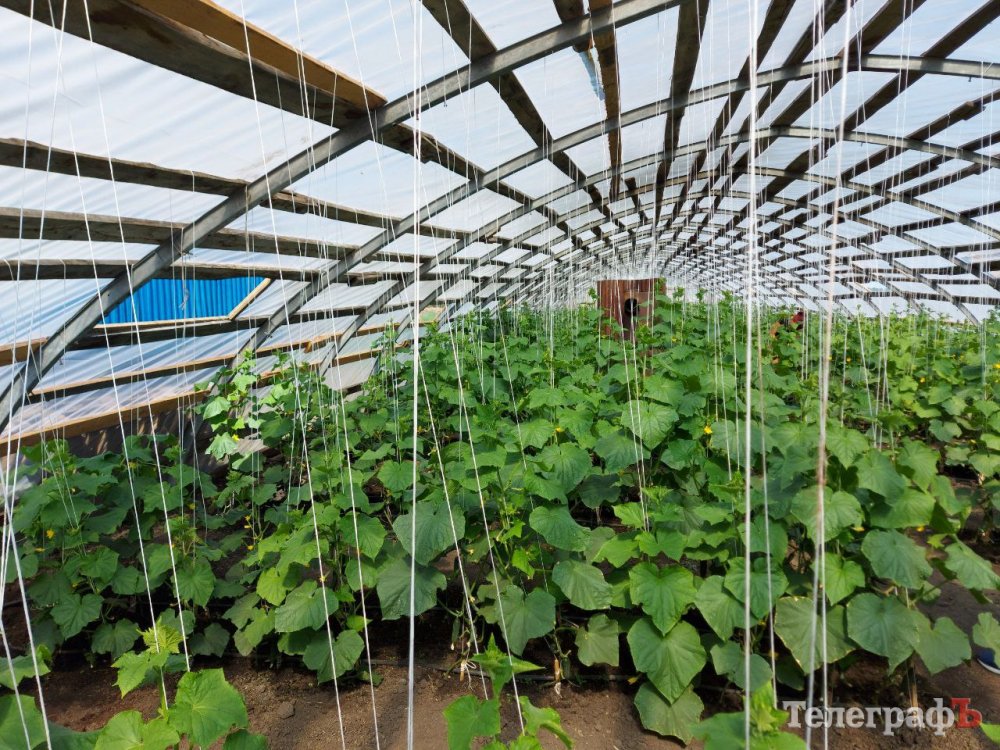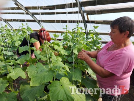 Огірки у теплиці збирають з червня по листопад. Зараз їх продають по 70 грн за кг. Працівниці пасинкують огірки — обривають бічні пагони, що ростуть з пазух листків, щоб вони не тягнули на себе сік і поживні речовини, а стиглі огірки були крупнішими.