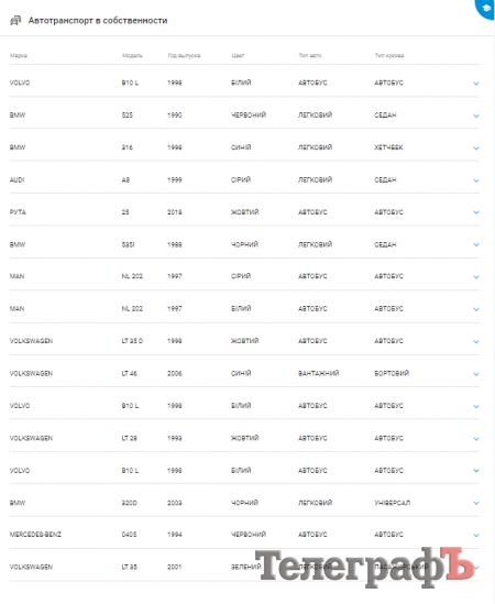 У системі вказано, що ФОП Мірошниченко Артем Костянтинович має у власності 16 одиниць транспорту, серед яких 9 — автобуси. Це три — Volvo, два — Man, два — Volkswagen, один — Mazda, один — Mercedes-Benz, один — Рута.