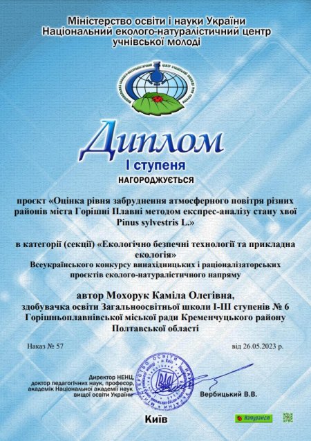Учні Горішньоплавнівської ЗОШ І-III ст. № 6 нагороджені дипломами І ступеня Національного еколого-натуралістичного центру учнівської молоді Міністерства освіти й науки України