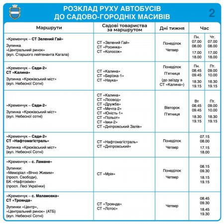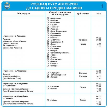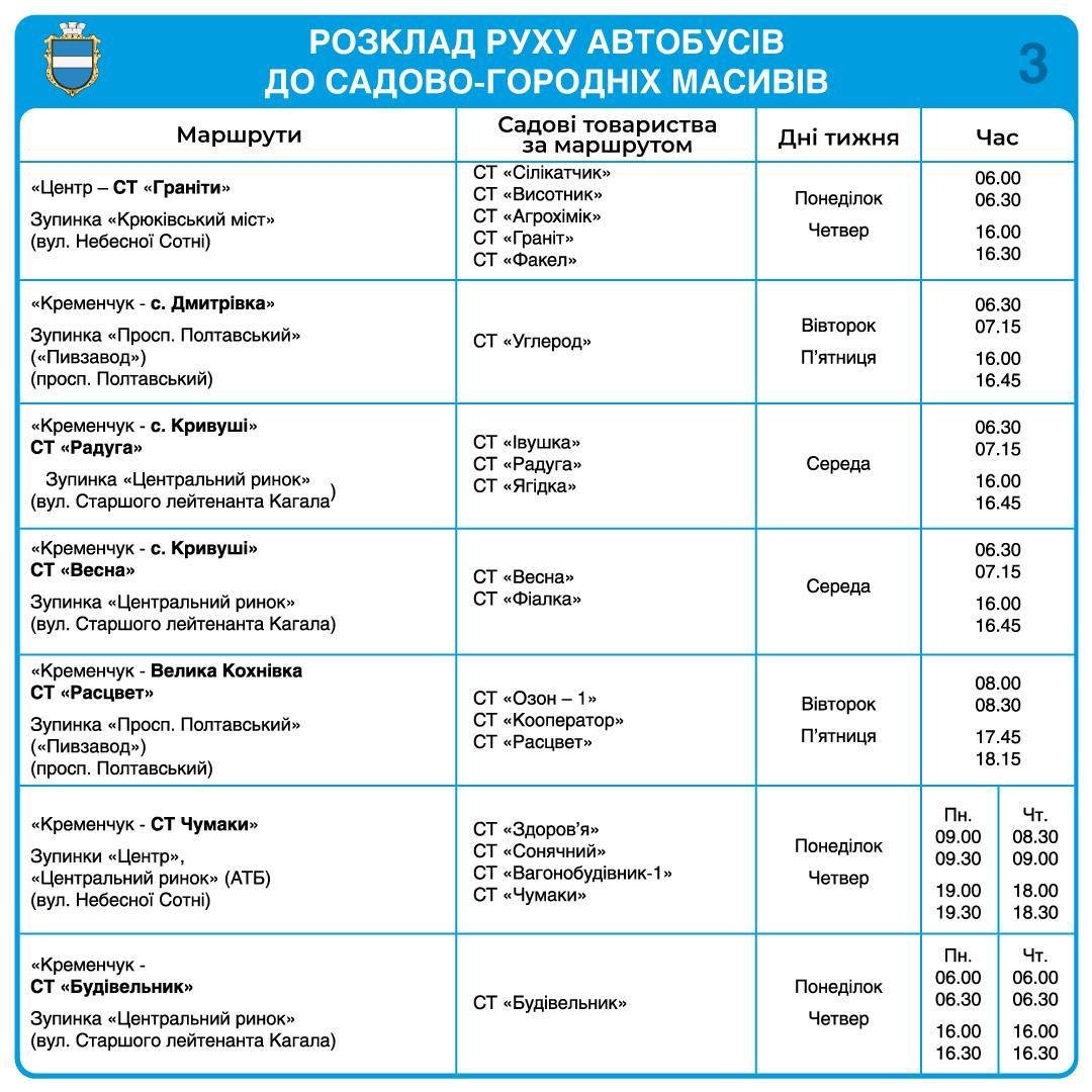 Автобуси їздитимуть за 17 маршрутами, що охоплюють 66 садових товариств Кременчуцької громади.