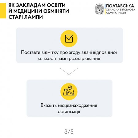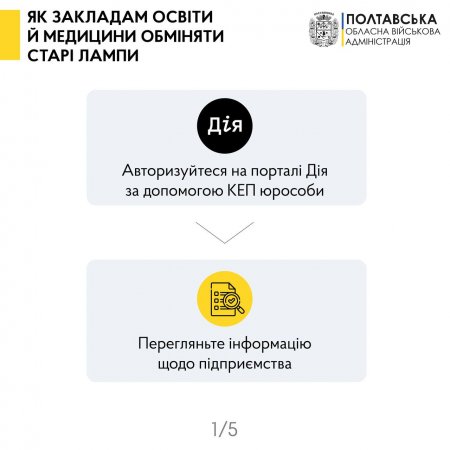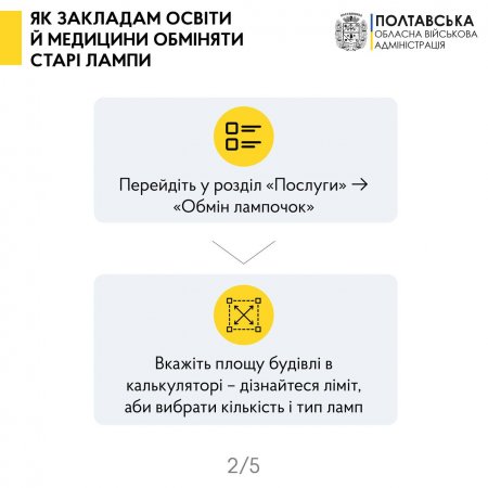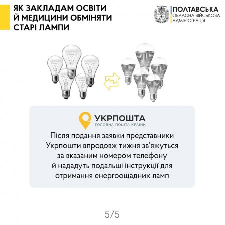 Обміняти старі лампи на нові LED відтепер можуть освітні й медичні заклади. Як повідомив начальник Полтавської обласної військової адміністрації, йдеться про дитсадки, школи, ПТУ, виші, спортивні й музичні школи, поліклініки, лікарні, стоматологічні клініки й інші профільні установи.