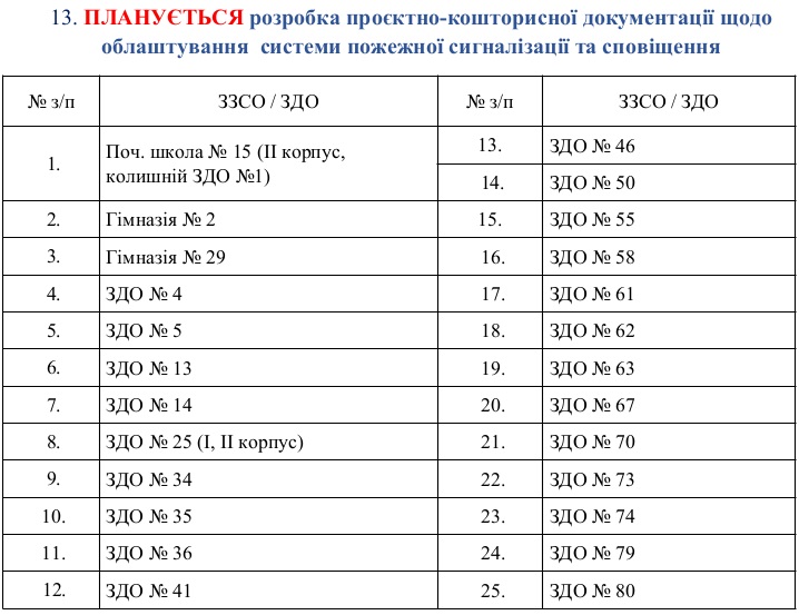 6. А ця таблиця інформує, що для початкової школи № 15 (II корпус, колишній заклад дошкільної освіти № 1), гімназій № 2 та 29, а також для 22 дитсадків лише планується розробка проєктно-кошторисної документації щодо облаштування систем пожежної сигналізації та сповіщення.