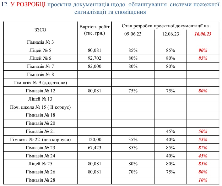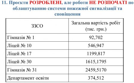 4. Для гімназій № 1 та 31, ліцеїв № 10, 17, 30, департаменту освіти проєкти розробили, але роботи ще не почалися.