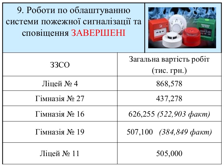 1. Є заклади освіти, де системи пожежної сигналізації та сповіщення вже були встановлені раніше — у дитсадку № 19, гімназії № 9 (крім спортивної зали та майстерні), 14, 33, початковій школі № 15.