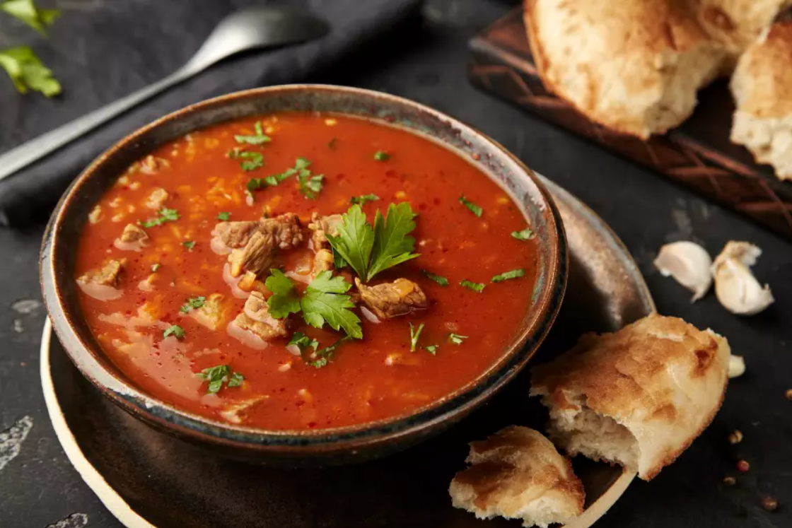 Яловичі ребра вимийте і розріжте. Помістіть у каструлю і залийте водою. Поставте на середній вогонь та доведіть до кипіння. Щойно бульйон закипів, зніміть піну. Покладіть у каструлю очищену моркву та цибулю (цілі). Варіть під закритою кришкою 1-1,5 години. Коли м’ясо буде готове, витягніть із каструлі моркву та цибулю.