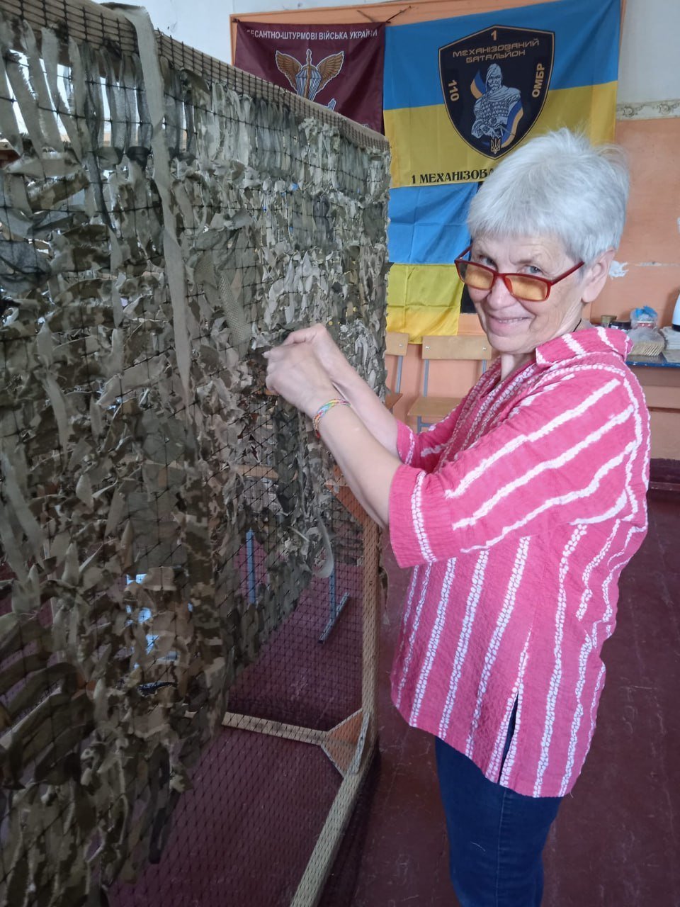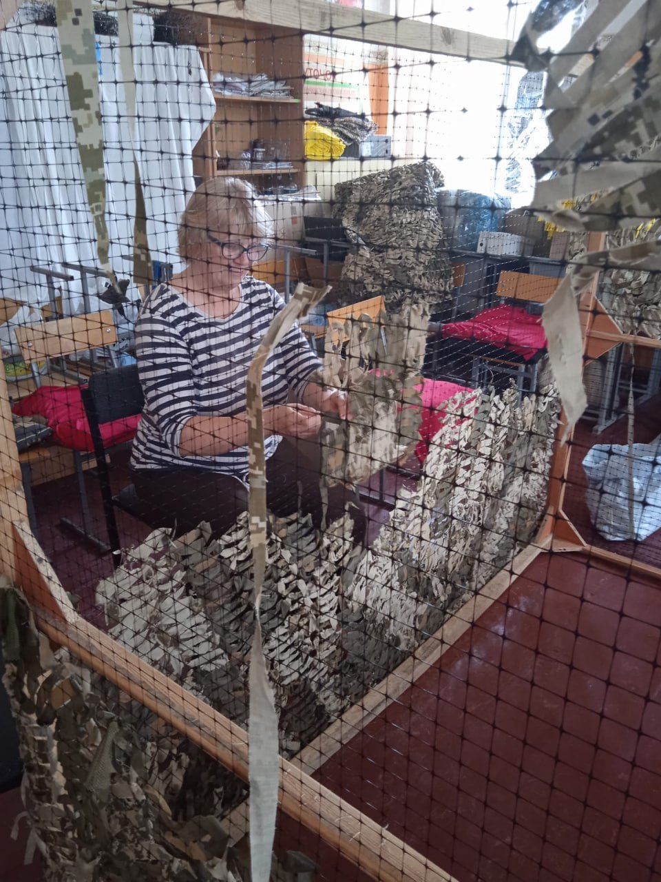 Працюють вони багато тижнів поспіль, відтоді як почалася повномасштабна війна. Але одна з активісток, Ірина Опритова, цією справою займається ще з 2014 року. Жінка каже, що за цей час локацій було дуже багато: і вдома плели, і в Міському саду, і зараз дуже раді, що адміністрація навчального закладу надала їм постійне приміщення.