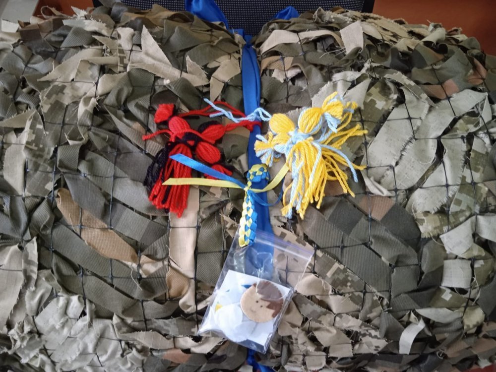 Виготовлені вироби дівчата акуратно складають, прикрашають логотипом. Також чіпляють ляльки-мотанки, хендмейд-іграшки у вигляді бабок-йожок або янголят, у які зашита молитва — їх виготовляє Наталія Чижикова, і віддають туди, де просять. Замовлень багато, бо зберегти людей та техніку неможливо без якісного маскування позицій.
