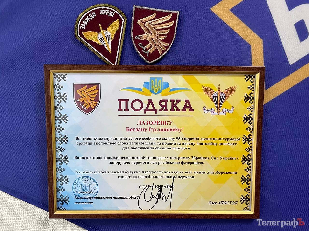Депутат Кременчуцької міської ради Богдан Лазоренко отримав подяку від командування та усього особового складу 95-ї окремої десантно-штурмової бригади, за надану благодійну допомогу.