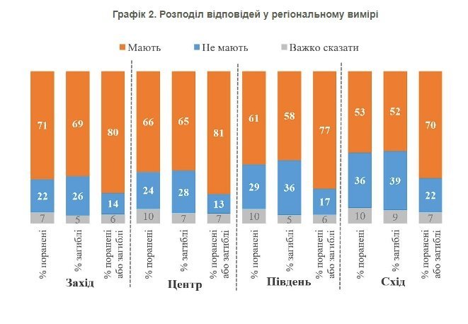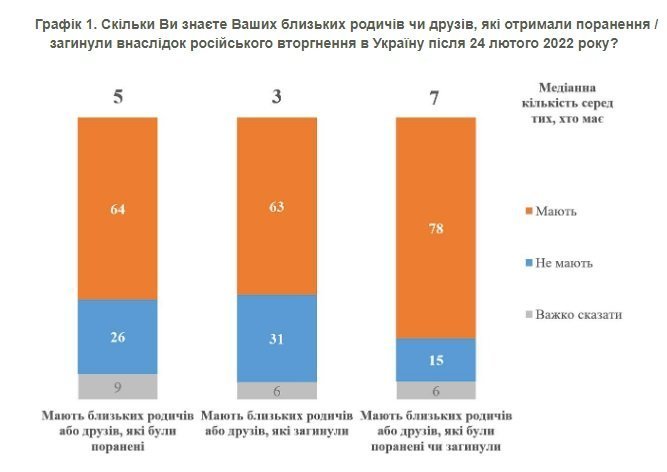 64% українців мають принаймні одного близького родича або друга, який був поранений (в середньому мають 5 поранених близьких людей), а 63% мають принаймні одного близького родича або друга, який загинув (в середньому мають 3 загиблих близьких людей).
