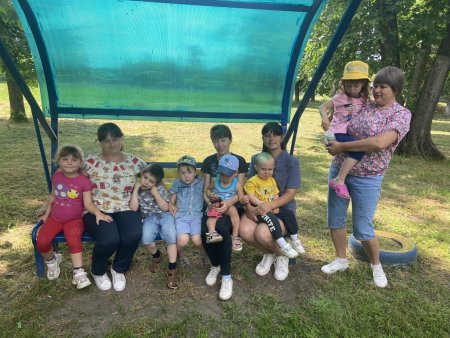 Під час нашого перебування у селі, діточки як раз були на прогулянці. Разом зі своїми вихователями вони гуляли на галявині, гойдалися, лазили сходами та качалися на гойдалці.