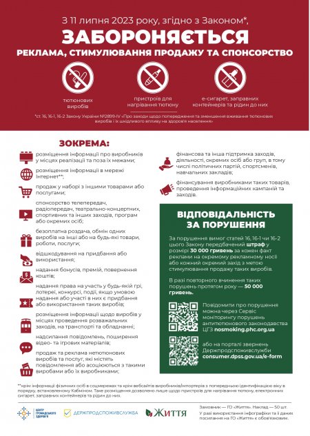 У відомстві нагадали, що з квітня 2023 року відновили контроль за дотриманням антитютюнового законодавства. Підставами для проведення позапланових заходів державного нагляду (контролю) у сфері антитютюнового законодавства є: самостійне звернення суб’єкта господарювання; доручення прем'єр-міністру України і звернення фізичної особи.