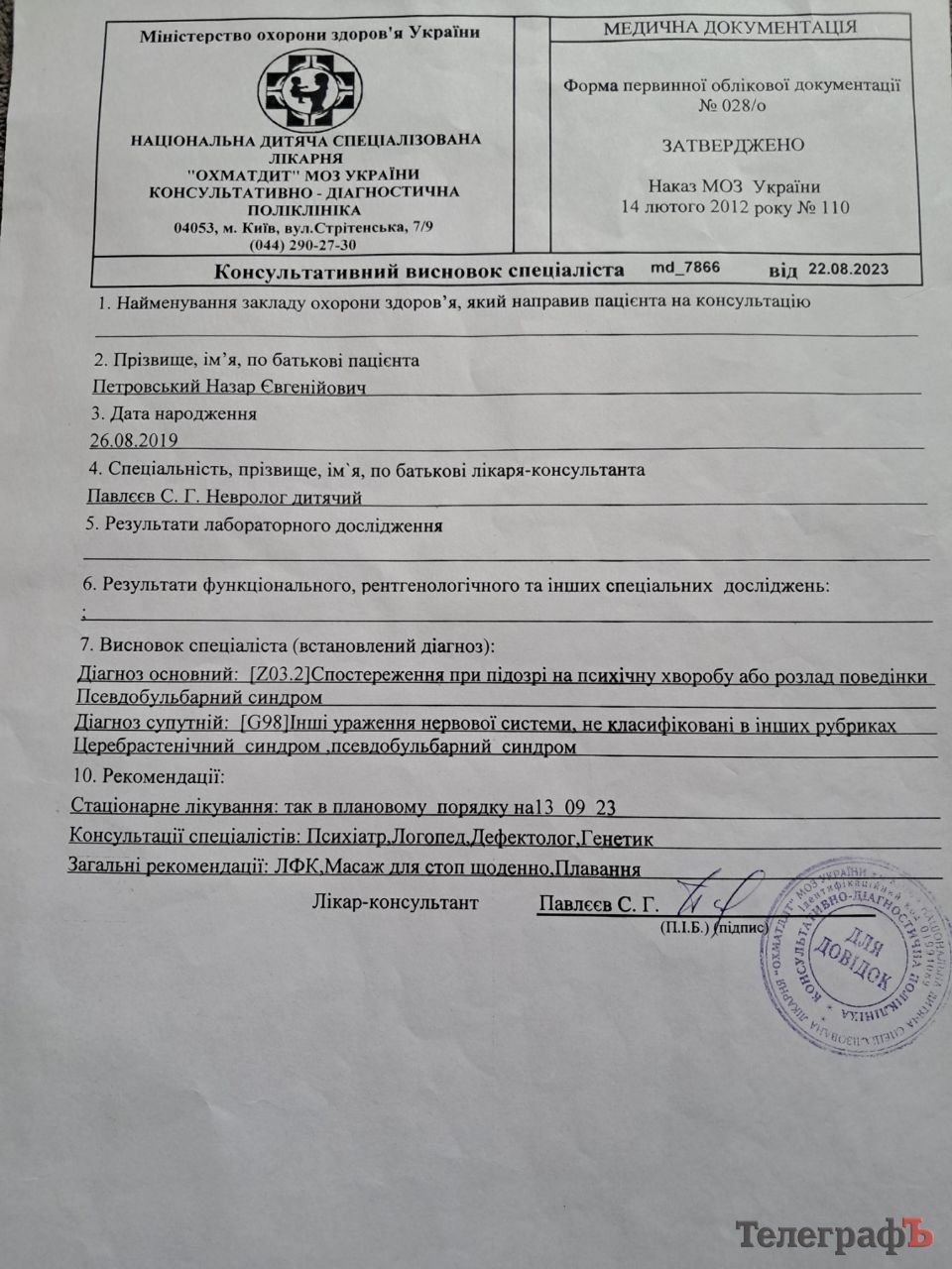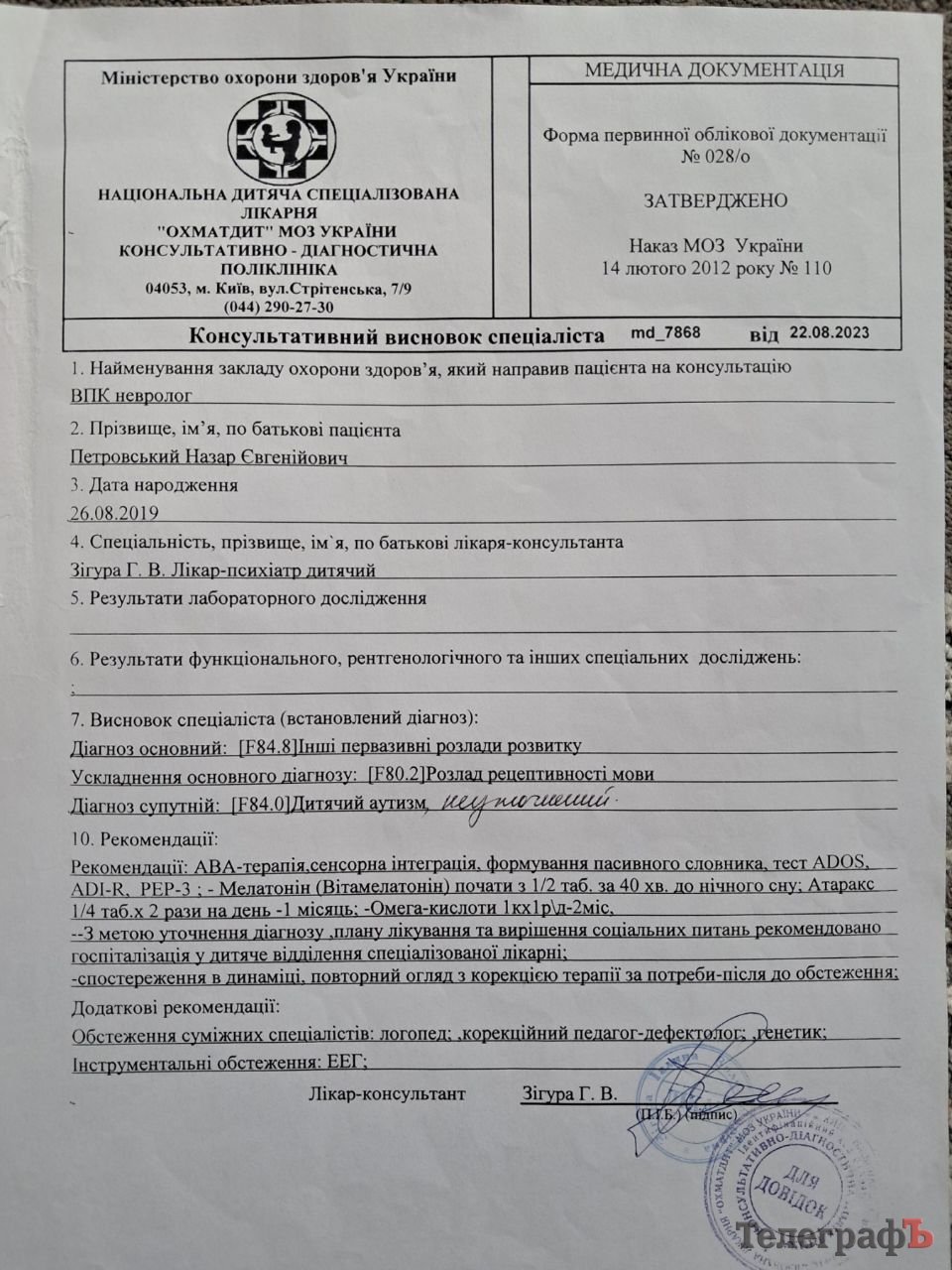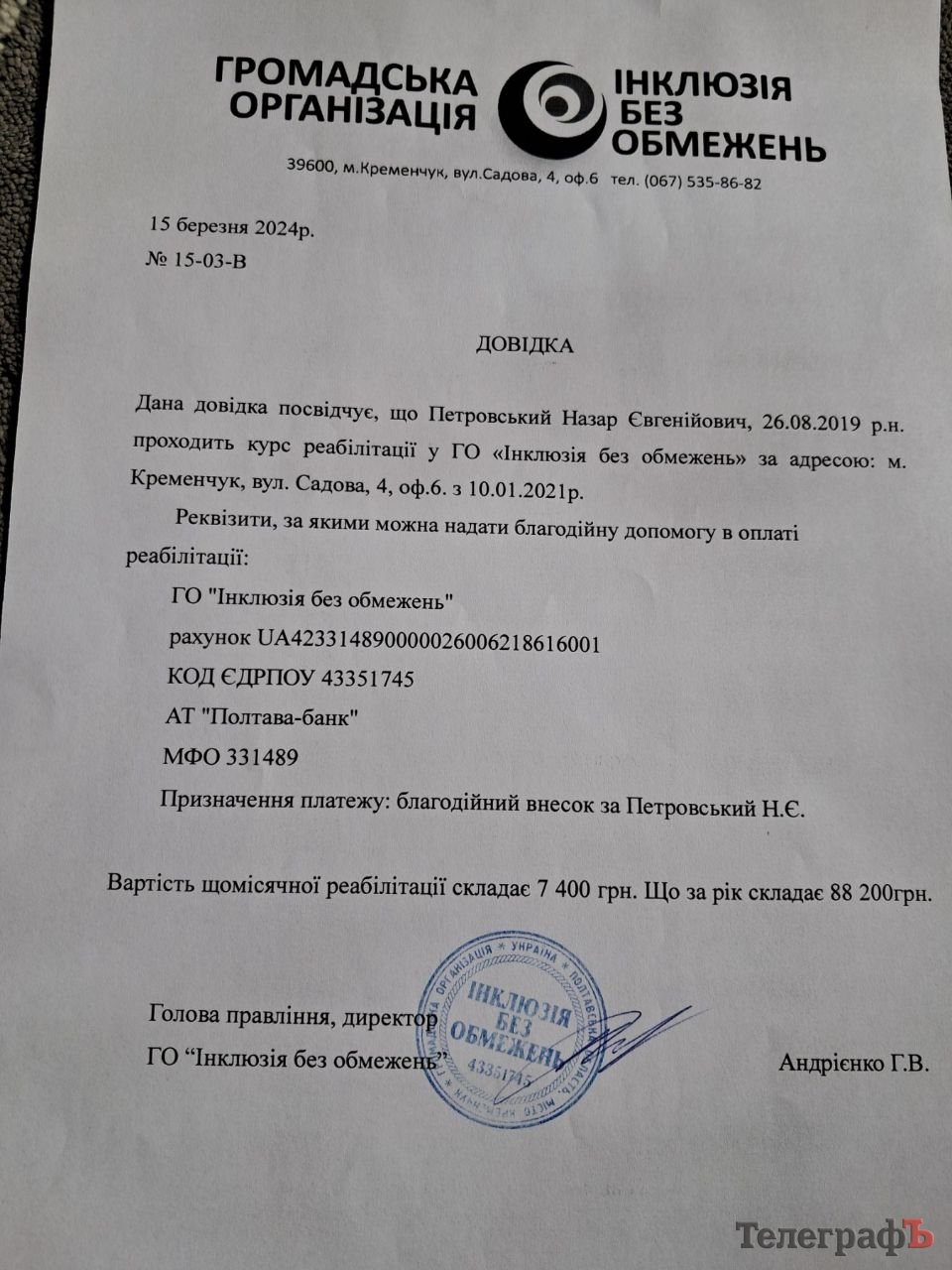 Кременчужанин Назар Петровський, який має діагноз ММД (мінімальна мозкова дисфункція), потребує допомоги. Мама хлопчика Євгенія — з дитинства має інвалідність по зору, через що не може влаштуватись на роботу, а тато працює підсобником.