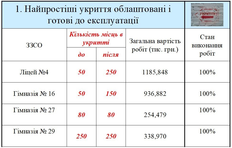 1. Шкіл, де укриття готові, так і залишилося 4. Проте загальна вартість робіт зросла у ліцеї №4 «Кремінь» – з 724,475 до 1185,848 тисячі грн, бо там замінювали внутрішні інженерні мережі підвальних приміщень.