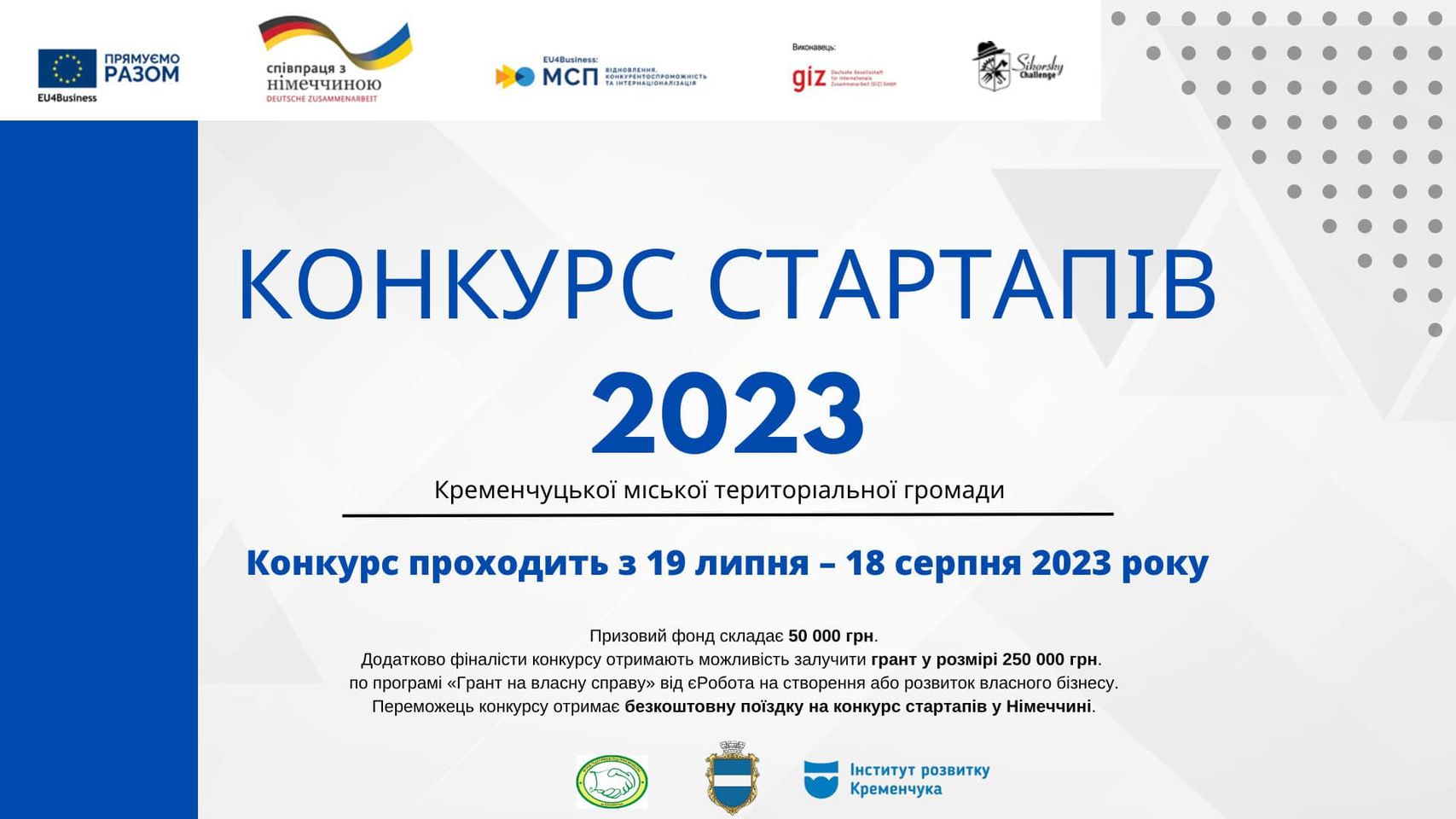 Конкурс стартапів-2023 Кременчуцької міської територіальної громади має призовий фонд у 50 000 гривень. Додатково фіналісти конкурсу отримають можливість залучити грант у розмірі 250 000 гривень за програмою «Грант на власну справу» від єРобота на створення або розвиток власного бізнесу. Переможець конкурсу матиме можливість взяти участь у навчальній поїздці до Німеччини.