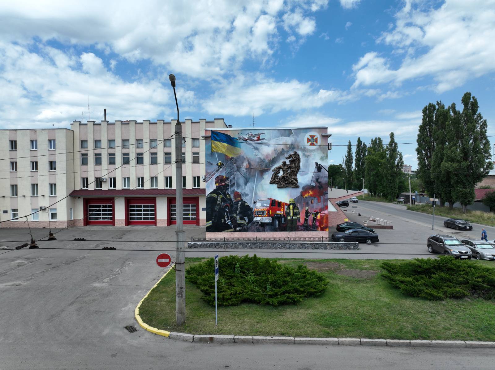 На стінописі зображується гасіння лісової пожежі, вогню в будинку та ліквідація наслідків російських обстрілів.