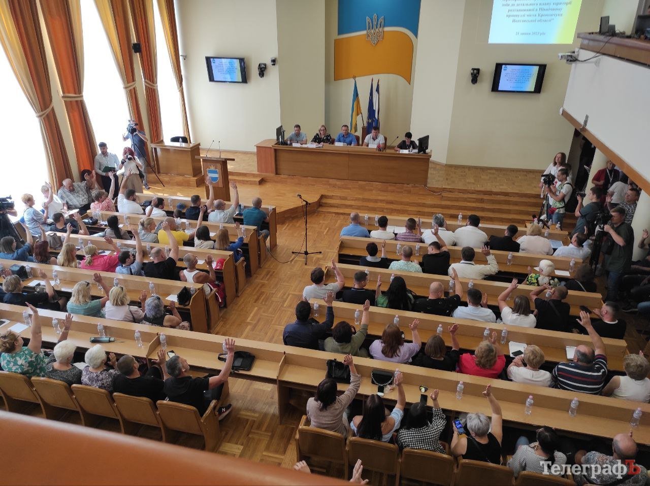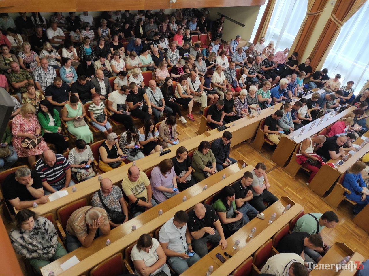 Посеред робочого дня до будівлі Кременчуцької міської ради учасників слухань запускали групами та через реєстрацію, а у сесійній залі було ніде яблуку впасти. На жаль, через повітряну тривогу, початок громадських слухань прийшлося відкласти.