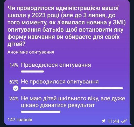 Вже після публікації цього матеріалу батьки звернулися до «Кременчуцького Телеграфа» і розповіли: їхнє обурення почалося, коли дізналися, що на депутатській комісії 3 липня Геннадій Москалик повідомив, що опитування в школах щодо того, як будуть навчатися учні, вже було проведене. І буцімто більшість батьків зазначили, що не поведуть своїх дітей до шкіл. Однак батьківська спільнота зазначає, що на той момент ніхто думку кременчужан не питав, це підтвердило голосування у телеграм-чаті «Департамент батьків». Тому вони й ініціювали опитування, про яке йшлося вище.