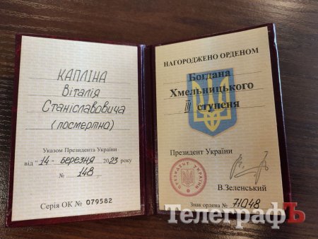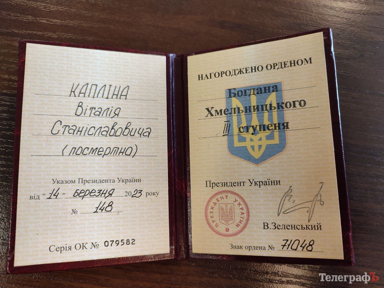 Сьогодні вранці в Кременчуцькій районній військовій адміністрації вручили орден Богдана Хмельницького III ступеня дружині загиблого захисника України старшого солдата Віталія Капліна. Почесну нагороду Ірині передав заступник начальника Кременчуцької РВА Артем Даценко.