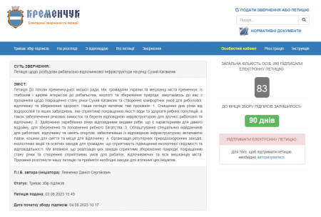 Третього серпня на сайті мерії зʼявилася петиція «щодо розбудови рибальсько-відпочинкової інфраструктури на річці Сухий Кагамлик». Збір підписів розпочався 4 серпня.