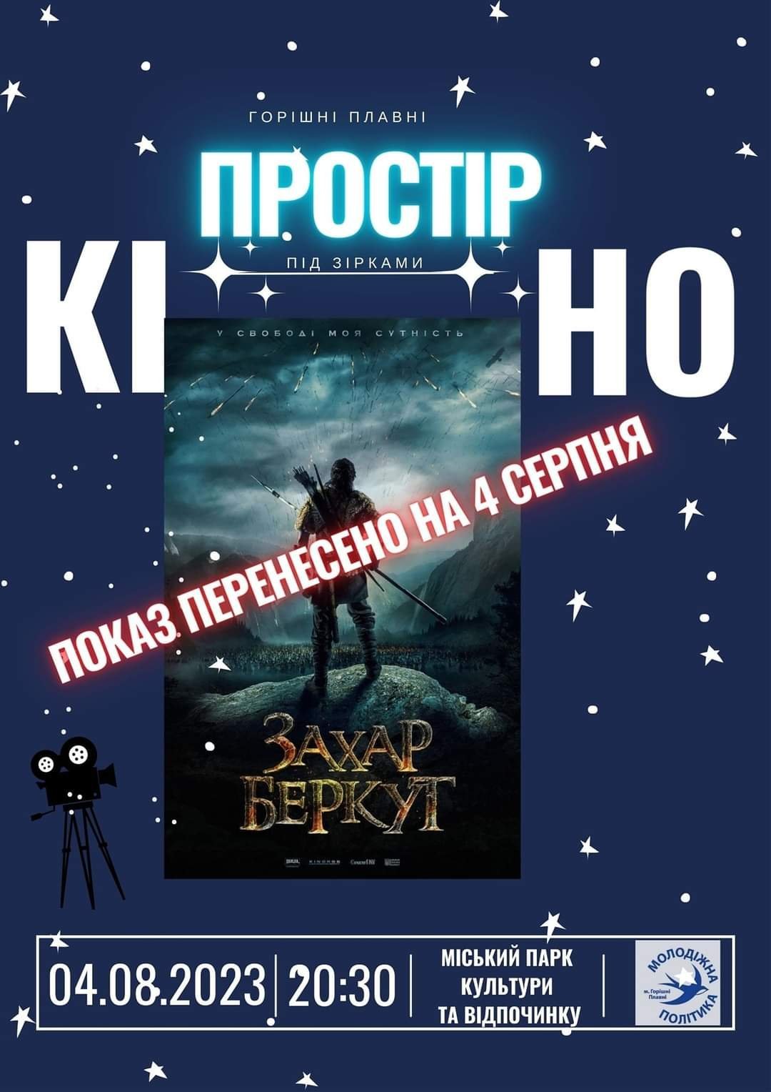 П’ятничного вечора, 4 серпня, в Горішніх Плавнях із другої спроби відбувся перший кінопоказ просто неба — на літній естраді Парку культури та відпочинку крутили «Захар Беркут», американсько-українську кінострічку 2019 року.