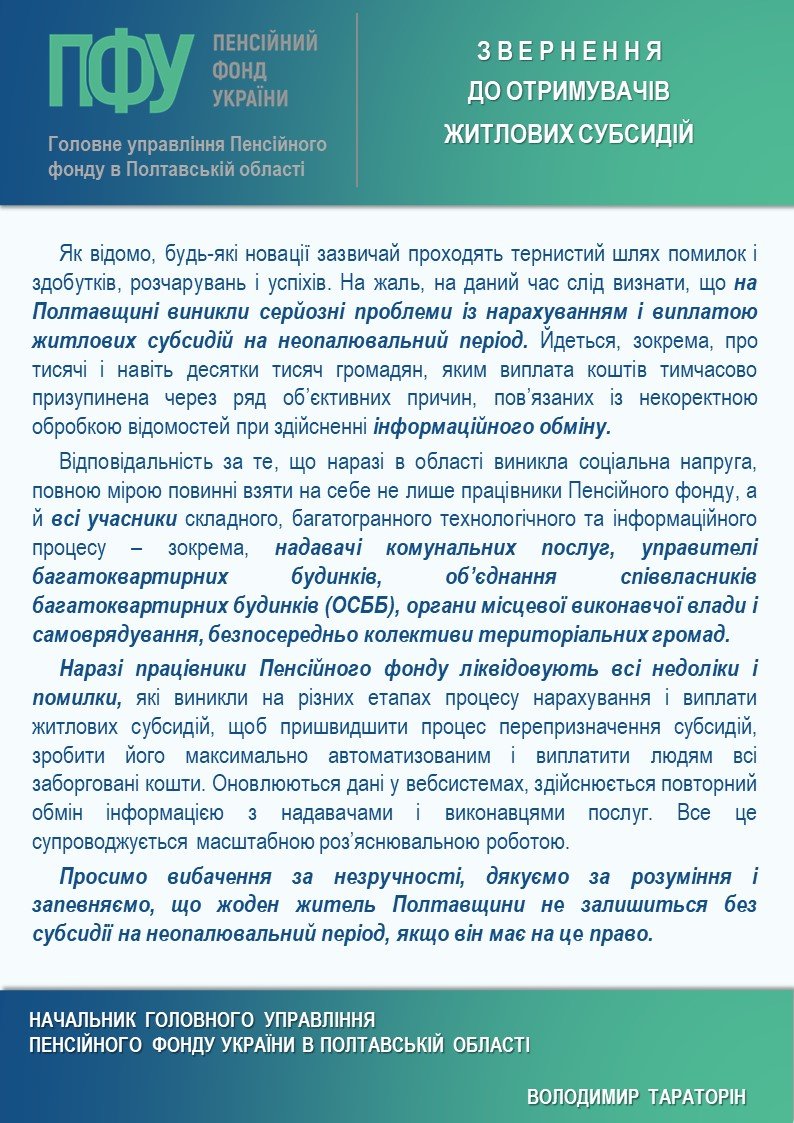 Вибачення та виправдання щодо «виниклих проблем з нарахуванням та виплатою житлових субсидій» ГУ ПФУ в Полтавській області розмістило вчора на своїй офіційній сторінці у Фейсбук, поклавши частину відповідальності на надавачів послуг, управителів багатоквартирних будинків та органи місцевого самоврядування.