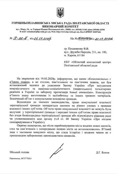 — Міський голова Горішніх Плавнів Биков мав демонтувати в’їзні знаки у формі монументальних стел «Комсомольськ» відповідно до підпункту «д» пункту 4 частини першої статті 1 Закону «Про засудження комуністичного та націонал-соціалістичного (нацистського) тоталітарних режимів в Україні та заборону пропаганди їхньої символіки» ще у 2016 році. Адже 19 травня 2016 року Верховна Рада перейменувала Комсомольськ у Горішні Плавні в межах виконання закону про декомунізацію, — розповів Пустовгар.