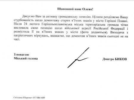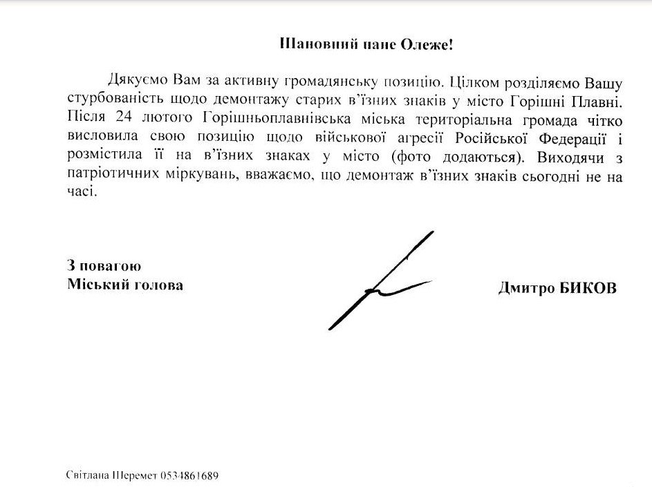 Владі Горішніх Плавнів пора збагнути, що ігнорування норм декомунізаційного закону широкий загал і воїни ЗСУ зокрема сприймають нині ще і як підігрування російським окупантам, — наголосив Пустовгар.