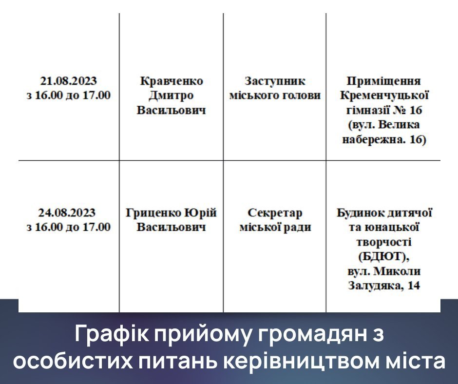 Цього тижня відбудуться прийоми громадян з особистих питань заступником міського голови Дмитром Кравченко та секретарем Кременчуцької міської ради Юрієм Гриценко. Записатись на прийом можна за телефоном: 098-988-31-33