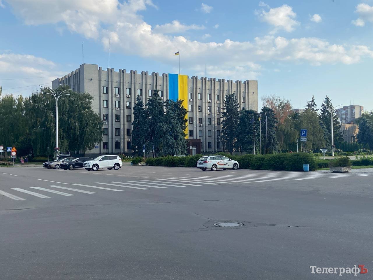 Нагадаємо, що в Кременчуці та області заборонили масові заходи. Тож повторюється тогорічна історія. Тоді також величезний синьо-жовтий прапор на фасаді міськради був, а дозволу на масові заходи не було.