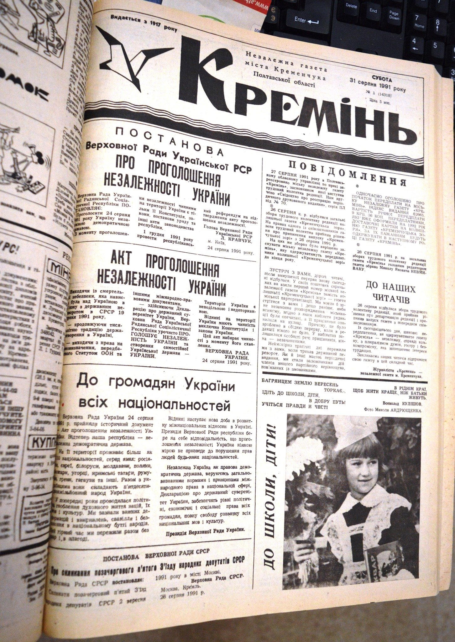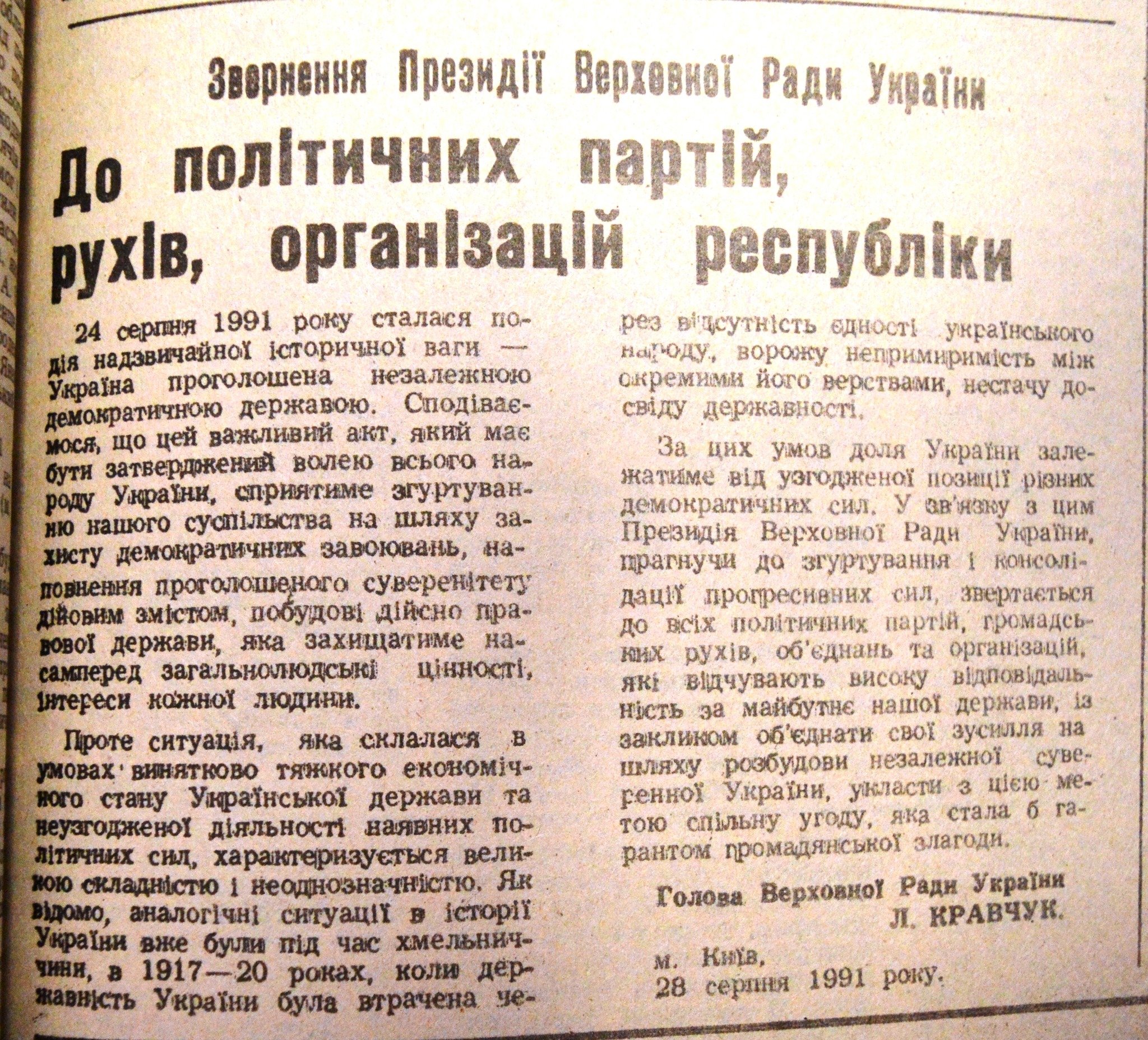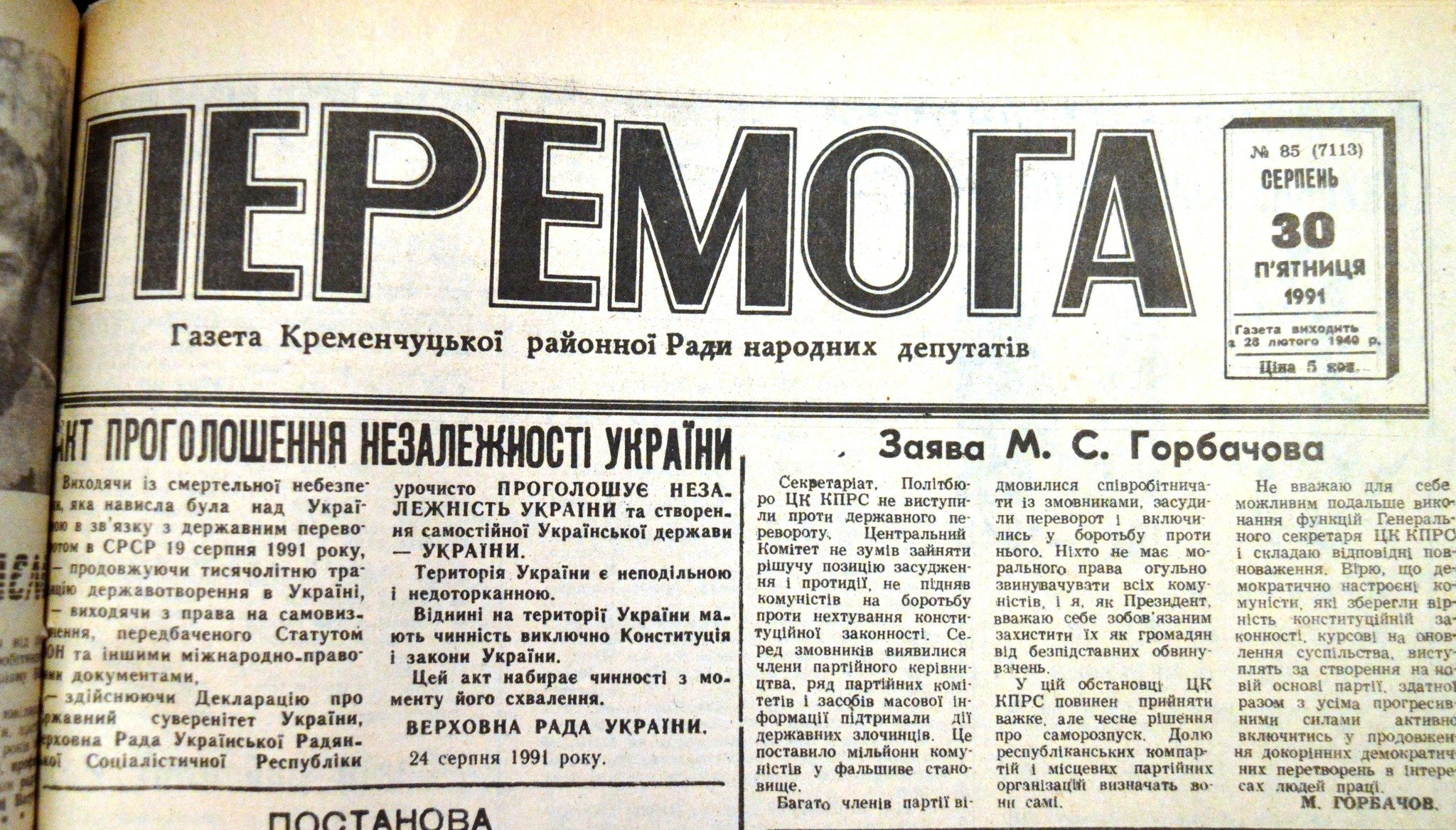 Так, у газеті Кременчуцької районної Ради народних депутатів «Перемога» були опубліковані: Акт проголошення Незалежності України, Постанова Верховної Ради Української РСР про проголошення Незалежності України, Закон України про надання додаткових повноважень Голові Верховної Ради України, Постанова Верховної Ради України про департизацію державних органів, установ та організацій та Постанова Верховної Ради України про військові формування на Україні.