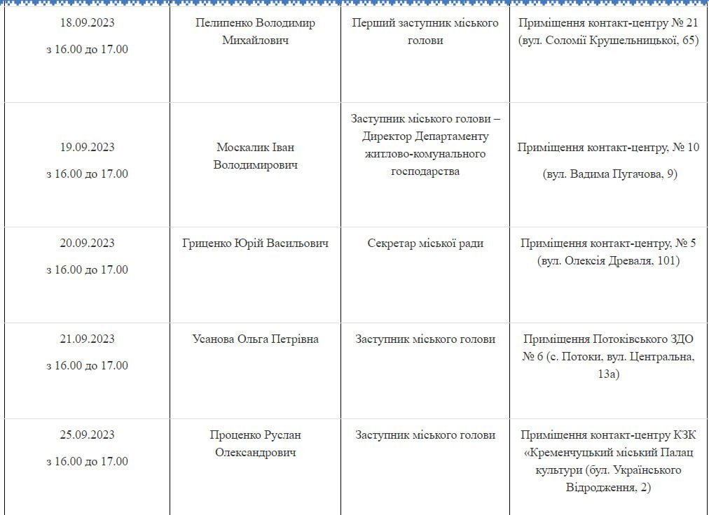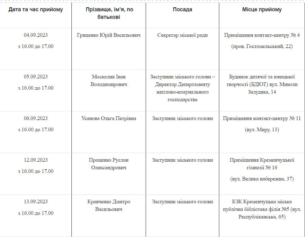 Пресслужба Кременчуцької міської ради опублікувала графік, за яким з 1 вересня міський голова та його заступники продовжать приймати кременчужан.
