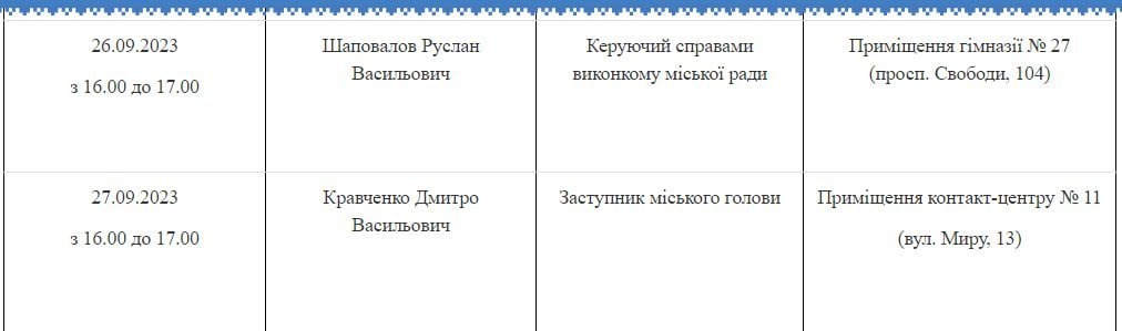 Прийоми міського голови відбудуться 14 та 28 вересня з 14.00 до 16.00 за попереднім записом. Заступники мера, секретар та керуючий справами виконкому міської ради прийматимуть людей відповідно до графіка (дивись нижче).