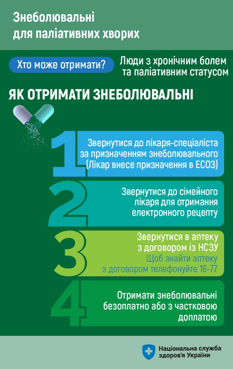 Як повідомили у Національній службі здоров’я України, отримати ці знеболювальні зможуть пацієнти, яким встановлені основний діагноз, паліативний статус та діагноз хронічний біль.