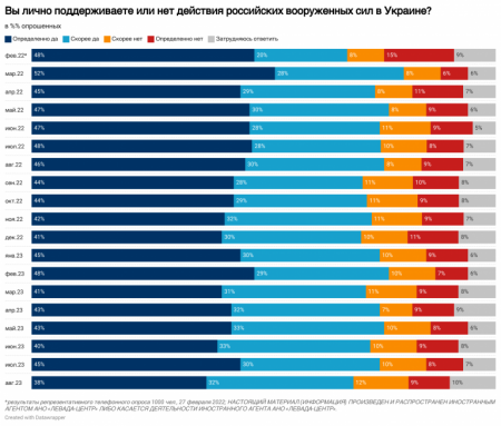 Більшість респондентів, опитаних у Росії, підтримують усі дії російської армії в Україні. При цьому лише 20% опитаних погоджуються піти на якісь поступки з боку РФ задля досягнення миру в Україні. Про це свідчать дані опитування, проведеного компанією «Левада-центр» наприкінці серпня 2023 року.