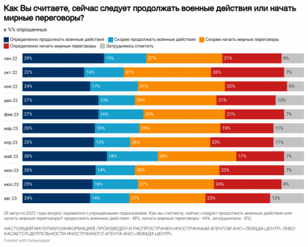 Як і в минулі місяці, прихильників переходу до мирних переговорів серед росіян дещо більше, ніж прихильників продовження воєнних дій в Україні. У серпні 50% респондентів вважають себе скоріше прихильниками мирних переговорів, ніж продовження війни (у липні таких було 51%). А категорично за продовження військових дій, або ж більше схиляються до цієї позиції – 38% респондентів (у липні – 41%).