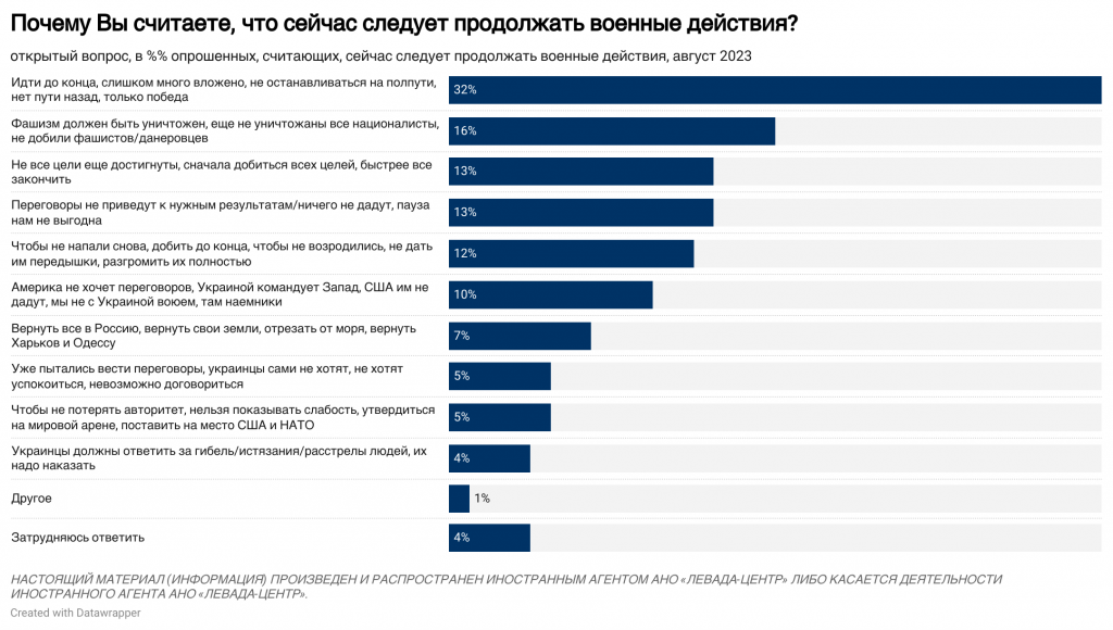 Серед прихильників продовження військових дій кожен третій (32%) пояснює свою думку тим, що «потрібно йти до кінця, не можна зупинятися на півдорозі». Повторюють тези російської пропаганди про «фашизм» в Україні 16% та вважають що «не усі цілі ще досягнути» – 13%. Стільки ж (13%) росіян вважають що «переговори не приведуть до потрібного результату та нічого не дадуть».