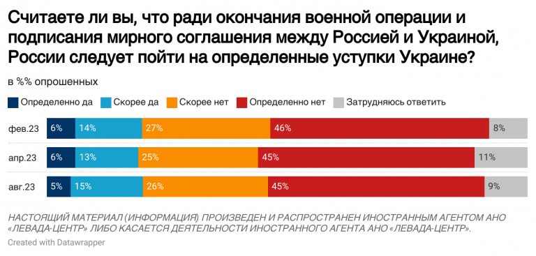 У «Левада-центр» зазначили, що тільки 20% опитаних респондентів вважають, що заради закінчення військових дій та підписання мирної угоди слід піти на певні поступки Україні (і лише 5% впевнені у тому, що згодні йти на поступки заради миру, 15% у цьому не повністю впевнені). А 71% опитаних респондентів виступають проти будь-яких поступок.
