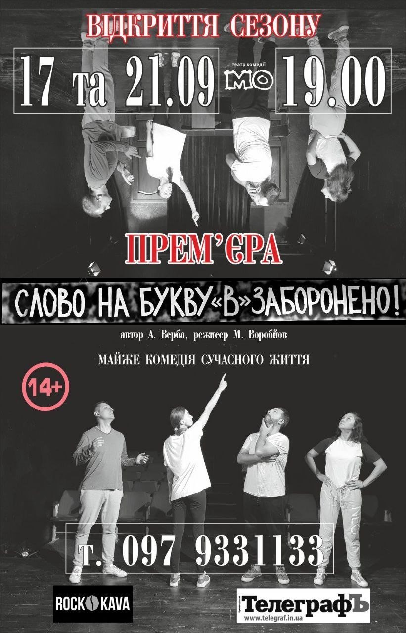 Театр комедії «МО» відкриває прем’єрою XI театральний сезон. Ставлять майже комедію сучасного життя «Слово на букву «В» заборонено!» за однойменною п’єсою А. Верби. Вистава щира, реалістична, з вірою у найкраще майбутнє.