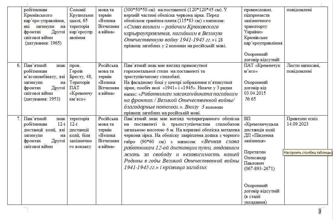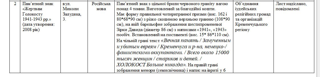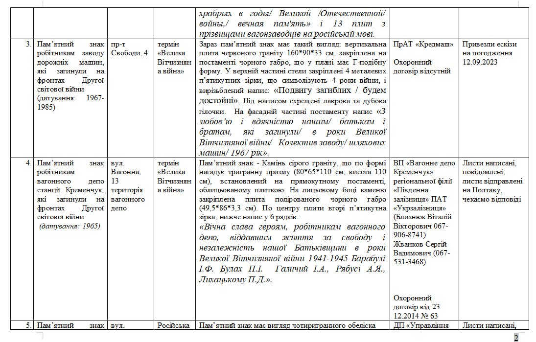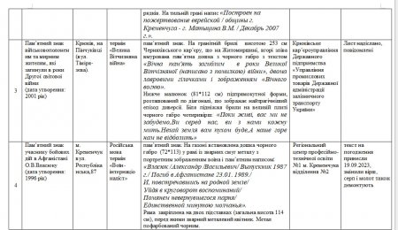 На 9 об’єктах культурної спадщини Кременчука мають змінити написи створені російською мовою, а також ті, у яких написано про Велику Вітчизняну війну. Про це стало відомо під час засіданні комісії з перейменування міських об’єктів топоніміки в рамках дерусифікації та деколонізації 20 вересня.