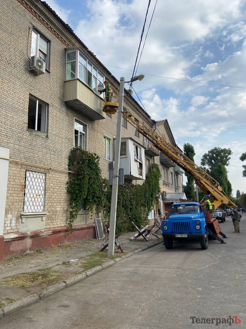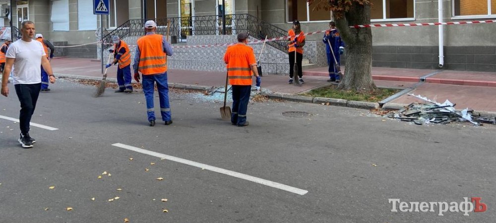 23 вересня кременчуцькі комунальники прибирають по місту наслідки удару, коли 22 вересня ворог поцілив в об’єкт цивільної інфраструктури у Кременчуці.
