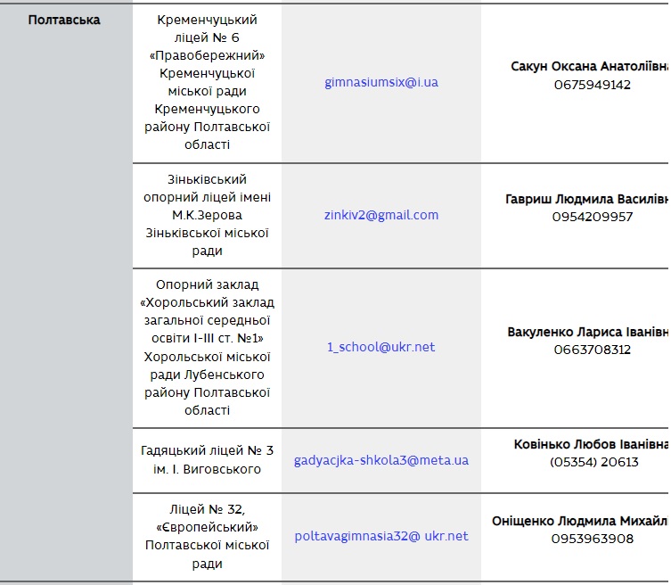 У нашому місті цим закладом став Кременчуцький ліцей № 6 «Правобережний», відповідальна особа — Оксана Анатоліївна Сакун, тел. (067-59) 4-91-42. Загалом до переліку увійшло 84 навчальні заклади з різних регіонів України і 5 — на Полтавщині.