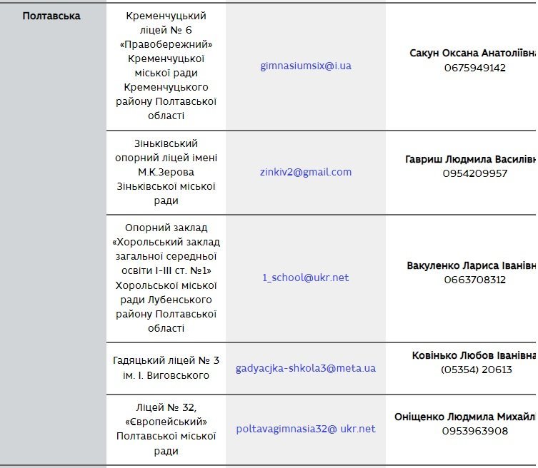 У нашому місті цим закладом став Кременчуцький ліцей №6 «Правобережний», відповідальна особа — Оксана Анатоліївна Сакун, тел. (067-59) 4-91-42. Загалом до переліку увійшло 84 навчальні заклади з різних регіонів України і 5 — на Полтавщині.