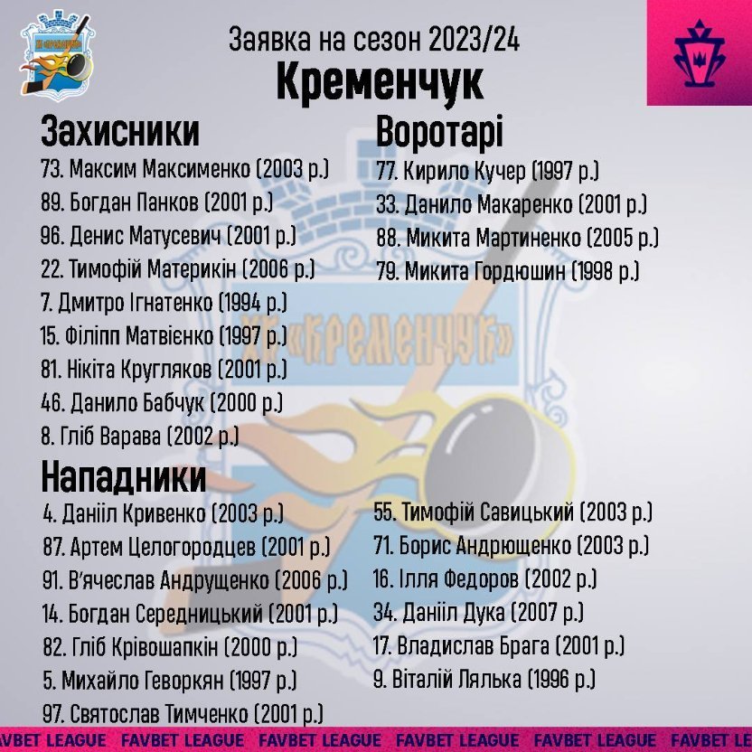 Матчі першого туру чемпіонату України з хокею 2023/2024 відбудуться з 30 вересня по 2 жовтня у Києві. «Кременчук» заявив на сезон 26 хокеїстів — це 4 воротарі, 9 захисників та 13 нападників.